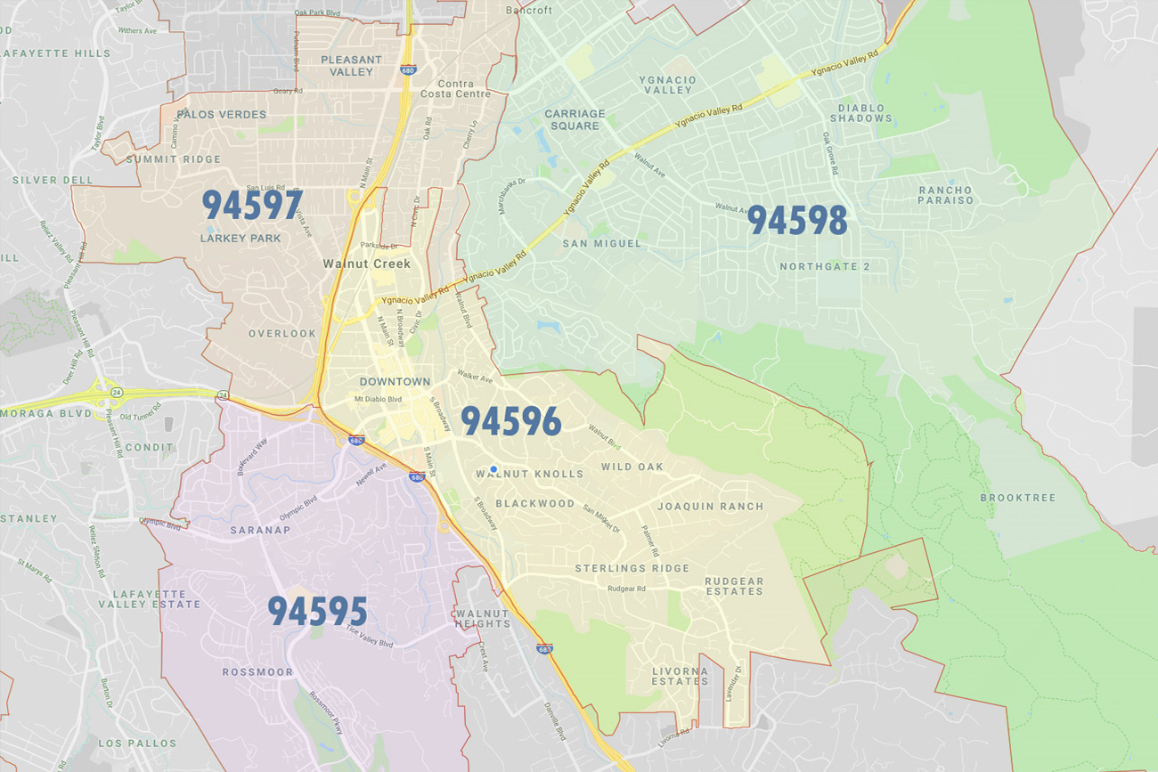 94597 - Northwestern Walnut Creek - Overlook, Larkey Park, Palos Verdes, Contra Costa Centre neighborhoods (bordering Pleasant Hill and Lafayette). Some Walnut Creek condominiums can be found in the eastern part of the 94597 zip code. The northern part of the 94597 zip code has a significant number of affordable older, smaller homes - some newly-renovated. Homes in the 94597 zip code generally have excellent freeway access, and are served by the Pleasant Hill BART station (acually located in northern Walnut Creek).